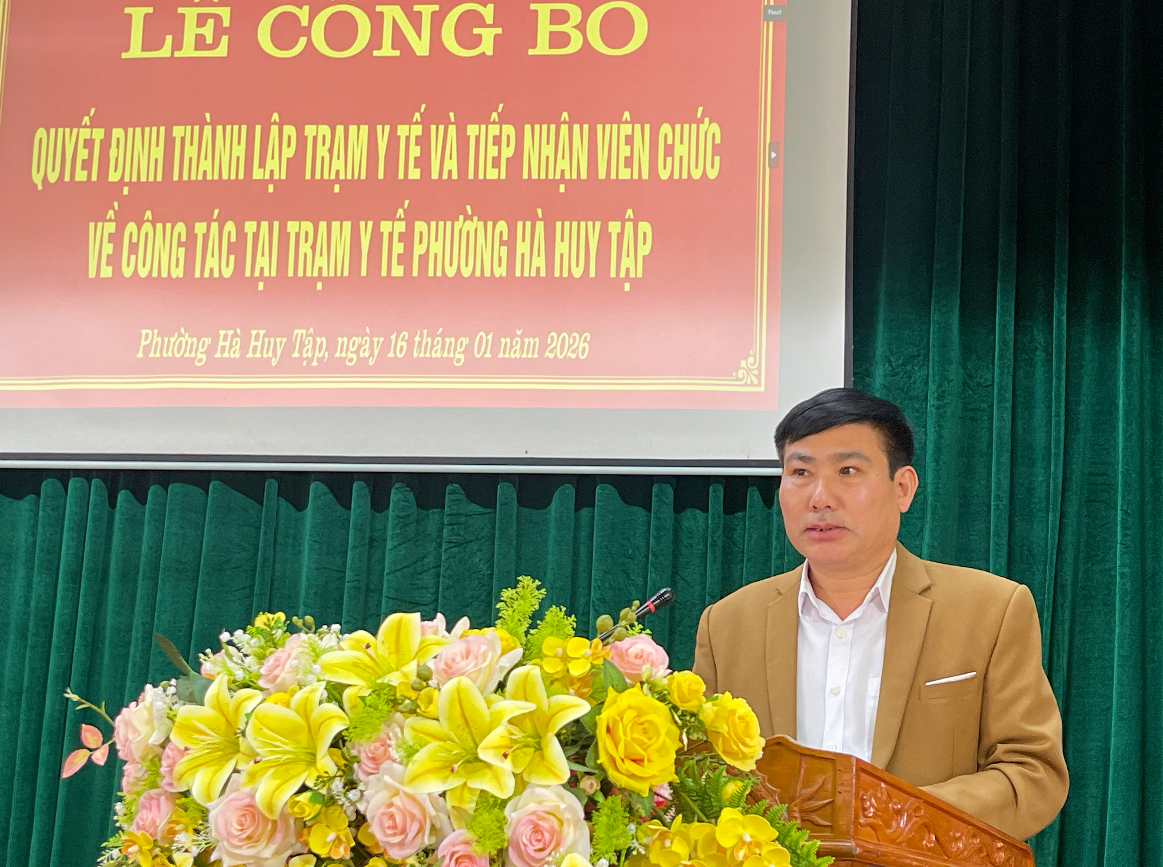 Đồng chí Phạm Mạnh Hiền, PCT UBND phường phát biểu giao nhiệm vụ tại lễ tiếp nhận Trạm Y Tế phường Hà Huy Tập