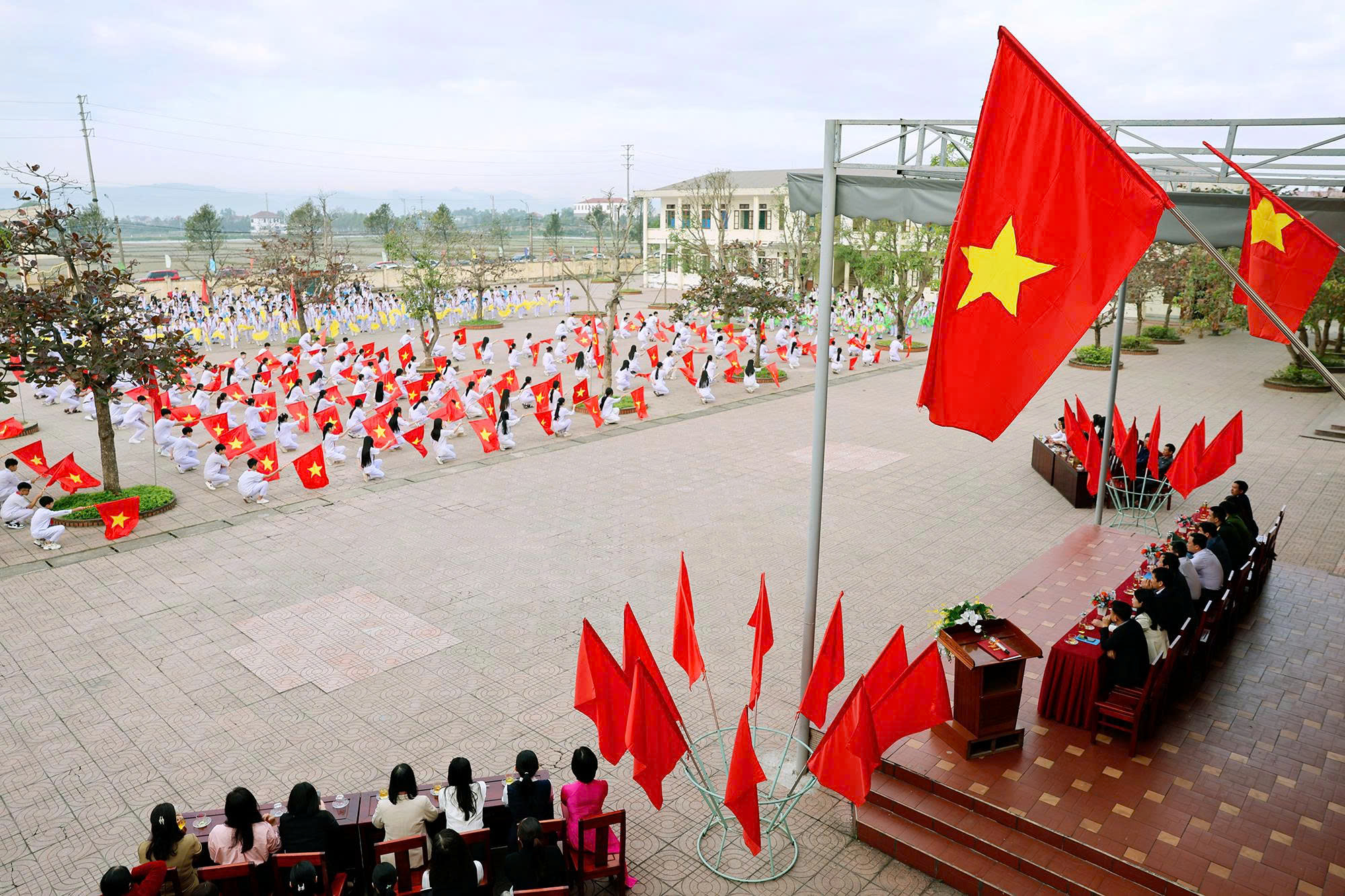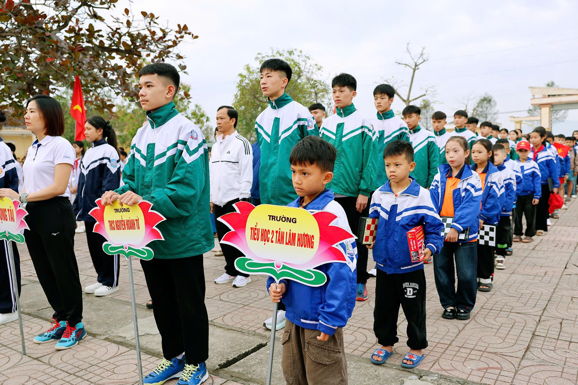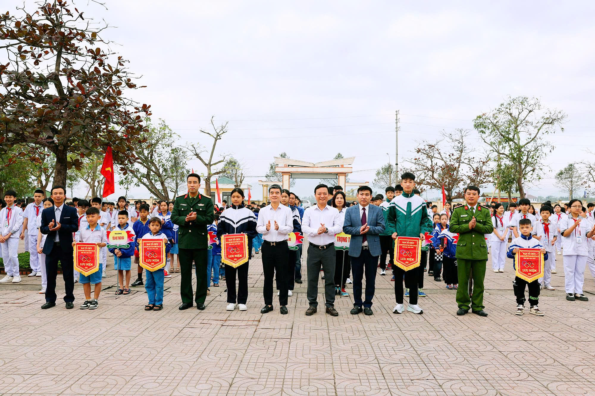 Các đại biểu tham dự lễ khai mạc tặng cờ thi đua cho các đội tuyển tham gia thi đấu tại Đại hội Điền kinh - Thể thao học sinh phổ thông phường Hà Huy Tập năm học 2025 -2026