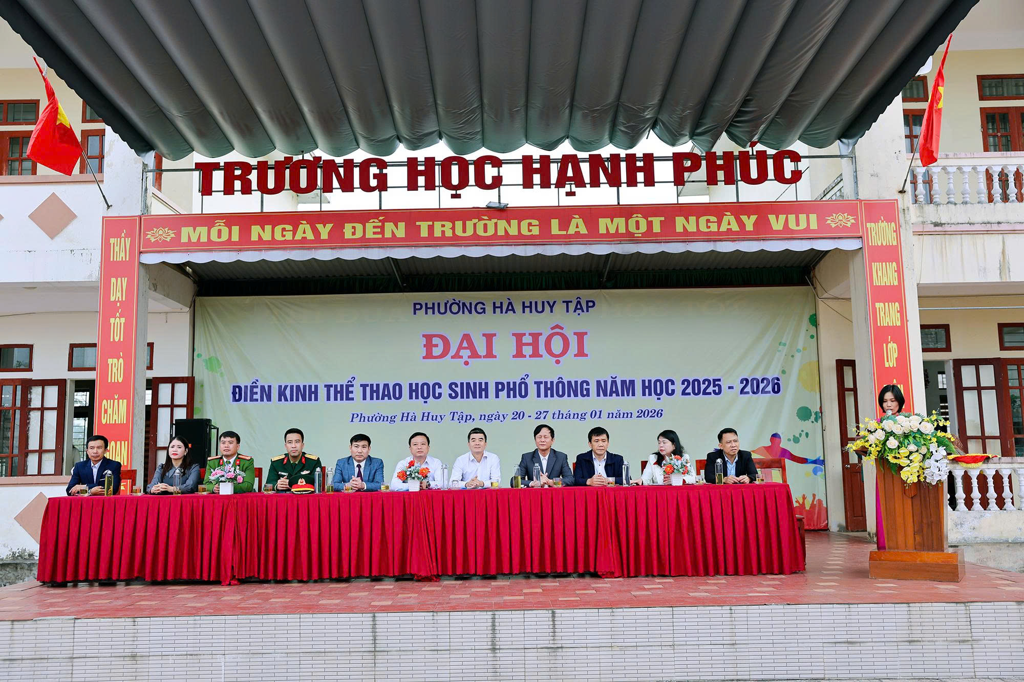 Phát biểu khai mạc Đại hội, Phó Chủ tịch UBND phường, Trưởng Ban tổ chức Đại hội Thể dục thể thao phường lần thứ I Phạm Mạnh Hiền, nhấn mạnh: Đại hội Điền kinh - Thể thao học sinh phổ thông phường Hà Huy Tập năm học 2025 - 2026, không chỉ là dịp đánh giá kết quả phong trào thể dục thể thao của các trường học phổ thông trên địa bàn; tạo sân chơi bổ ích để khuyến khích phong trào tập luyện thể dục thể thao xây dựng, môi trường giáo dục toàn diện cả về trí tuệ và thể chất trong các nhà trường. Mà thông qua đó, còn giúp phường và các nhà trường tuyển chọn những vận động viên xuất sắc để tập huấn và tham gia tranh tài tại Đại hội Điền kinh - thể thao học sinh phổ thông của tỉnh trong thời gian trung tuần tháng 3 tới.