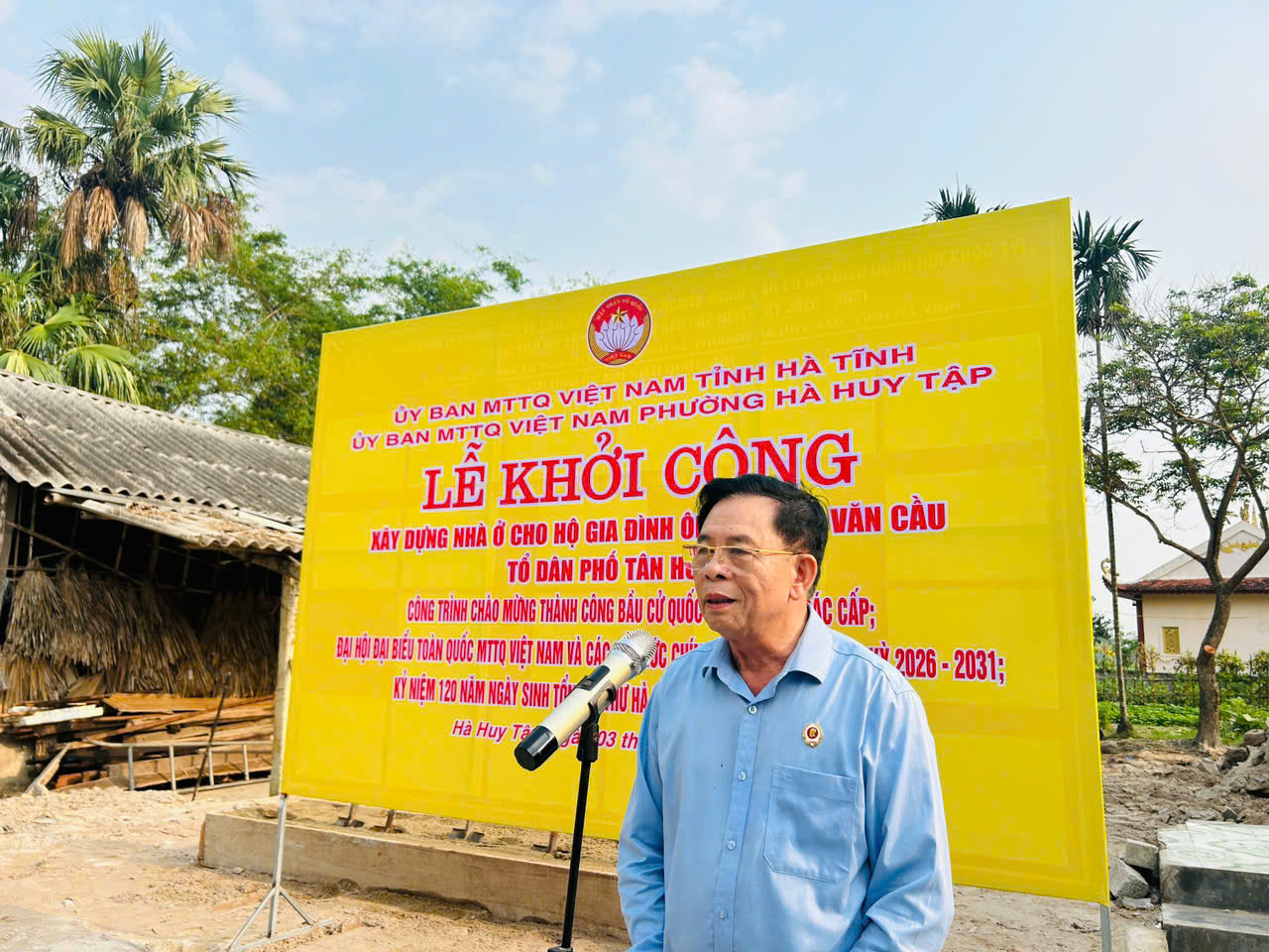 Thay mặt lãnh đạo tỉnh và phường, Thiếu tướng Nguyễn Đức Tới, Phó Chủ tịch Ủy ban MTTQ Việt Nam tỉnh, Chủ tịch Hội Cựu chiến binh tỉnh Hà Tĩnh phát biểu tại lễ khởi công nhà ông Cầu
