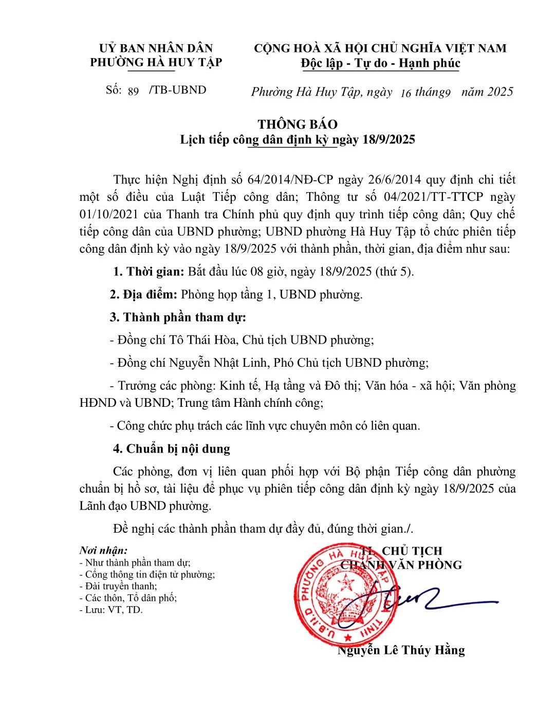 Thực hiện Nghị định số 64/2014/NĐ-CP ngày 26/6/2014 quy định chi tiết một số điều của Luật Tiếp công dân; Thông tư số 04/2021/TT-TTCP ngày 01/10/2021 của Thanh tra Chính phủ quy định quy trình tiếp công dân; Quy chế tiếp công dân của UBND phường; UBND phường Hà Huy Tập tổ chức phiên tiếp công dân định kỳ vào ngày 18/9/2025 với thành phần, thời gian, địa điểm như sau