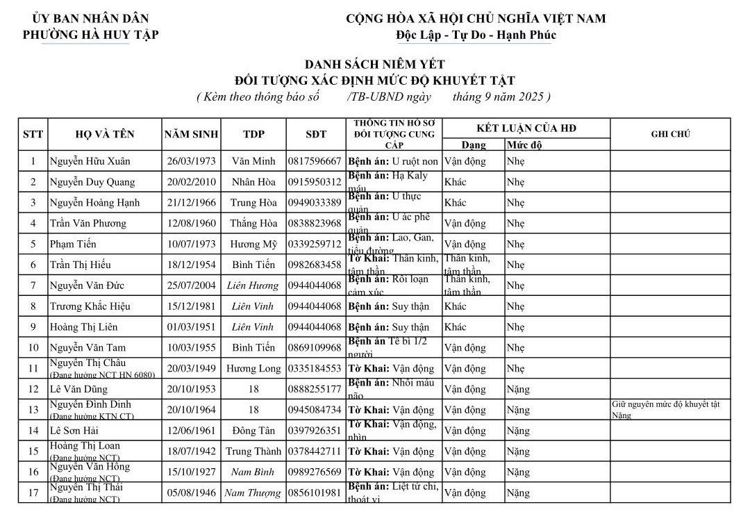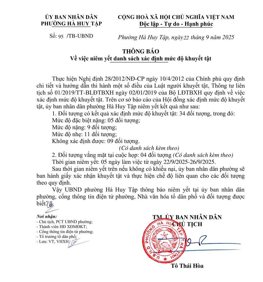 Ngày 22/9/2025, UBND phường Hà Huy Tập ban hành thông báo số 95/TB-UBND Về việc niêm yết danh sách xác định mức độ khuyết tật