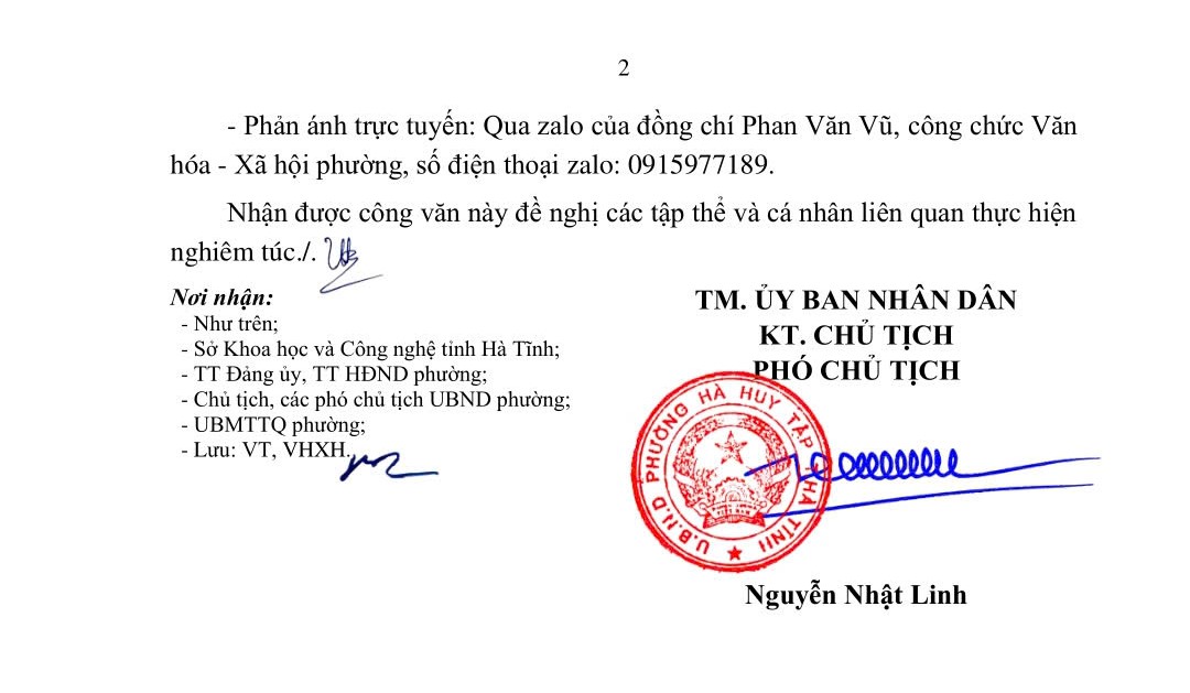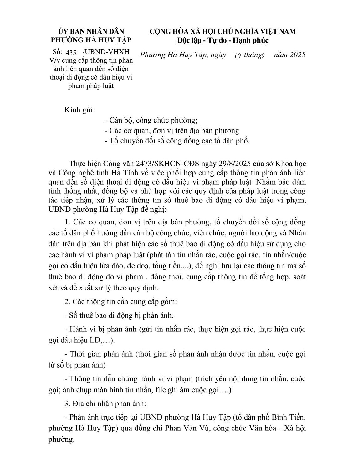 Ngày 10/9/2025, UBND phường Hà Huy Tập đã ban hành công văn số 435/UBND-VHXH về việc cung cấp thông tin phản ánh liên quan đến số điện thoại di động có dấu hiệu vi phạm pháp luật.